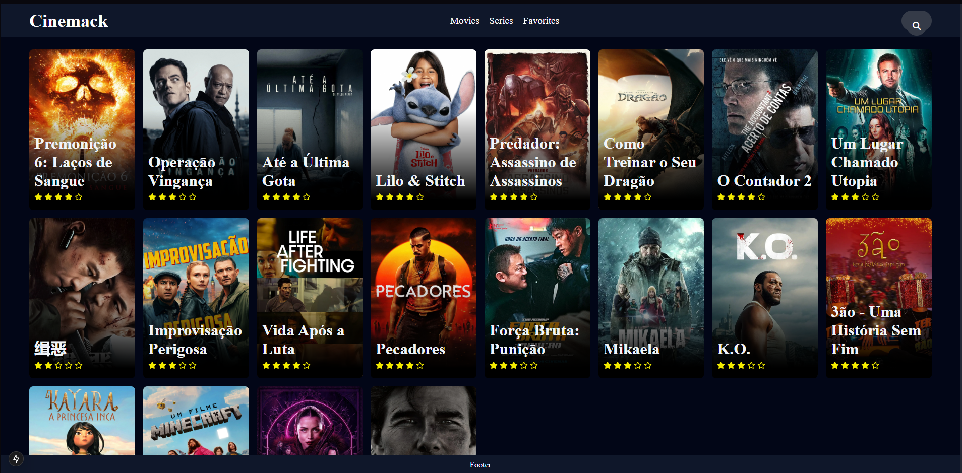 Plataforma de streaming inspirada na Netflix, onde usuários podem navegar, buscar e assistir trailers de filmes e séries. Possui interface moderna, categorias organizadas por gênero, sistema de login e exibição dinâmica de conteúdos com layout responsivo.