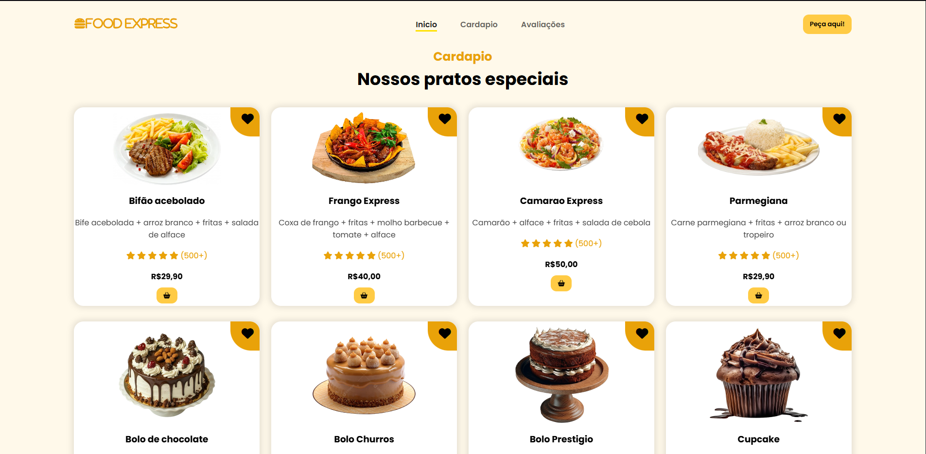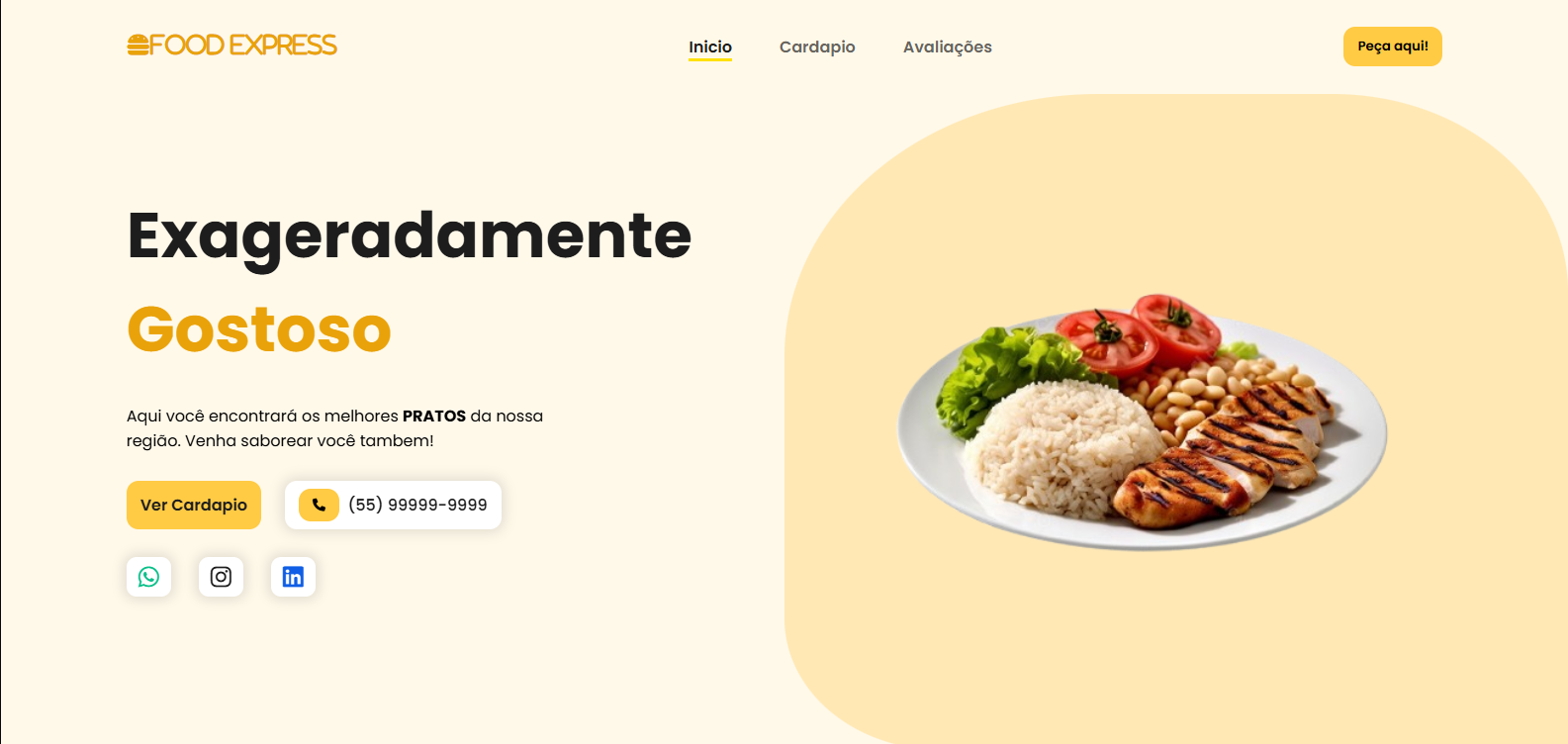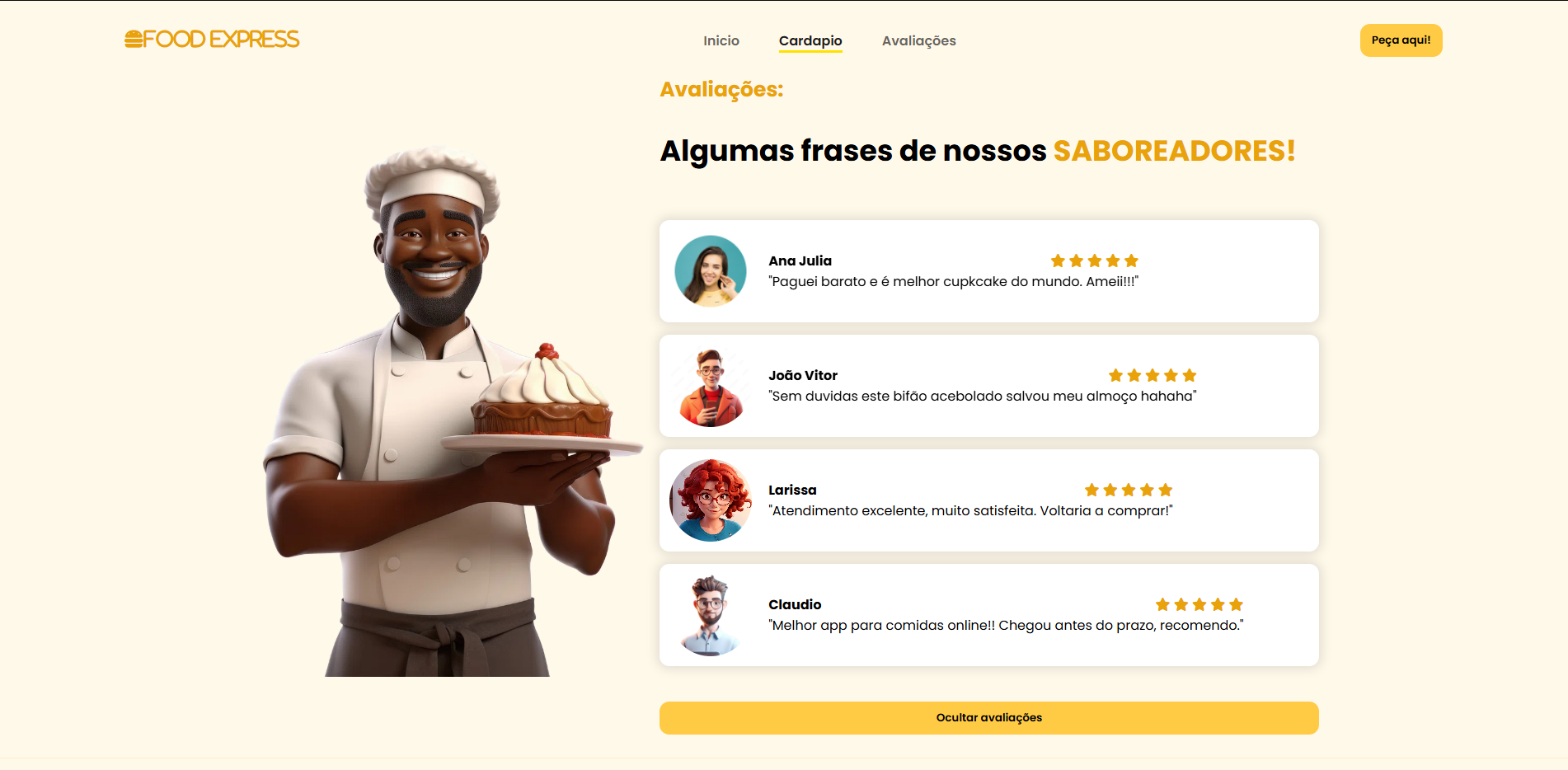 Página de apresentação desenvolvida para um serviço de delivery de comidas, com layout moderno, responsivo e visual atrativo. A landing page exibe as seções principais: introdução com chamada de ação, cardápio dinâmico com produtos, avaliações de clientes e links para contato.