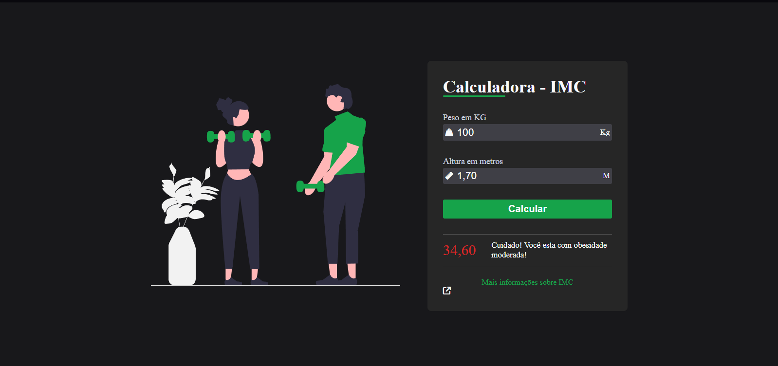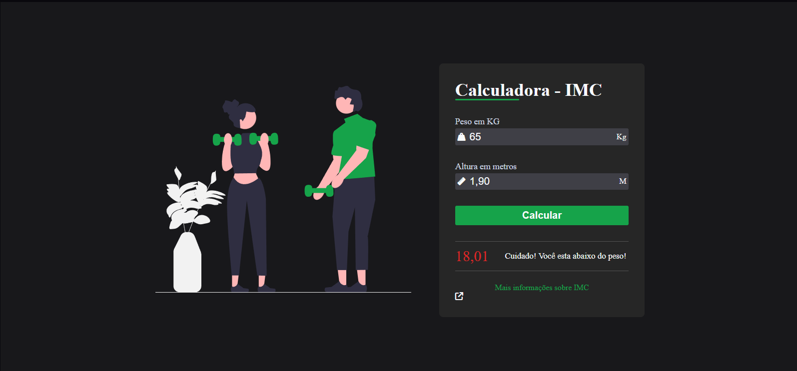 Aplicação desenvolvida para calcular o Índice de Massa Corporal (IMC) do usuário com base na altura e peso informados. Após o cálculo, o sistema exibe a classificação do IMC (como "Abaixo do peso", "Normal", "Sobrepeso", etc.) conforme os padrões da OMS.