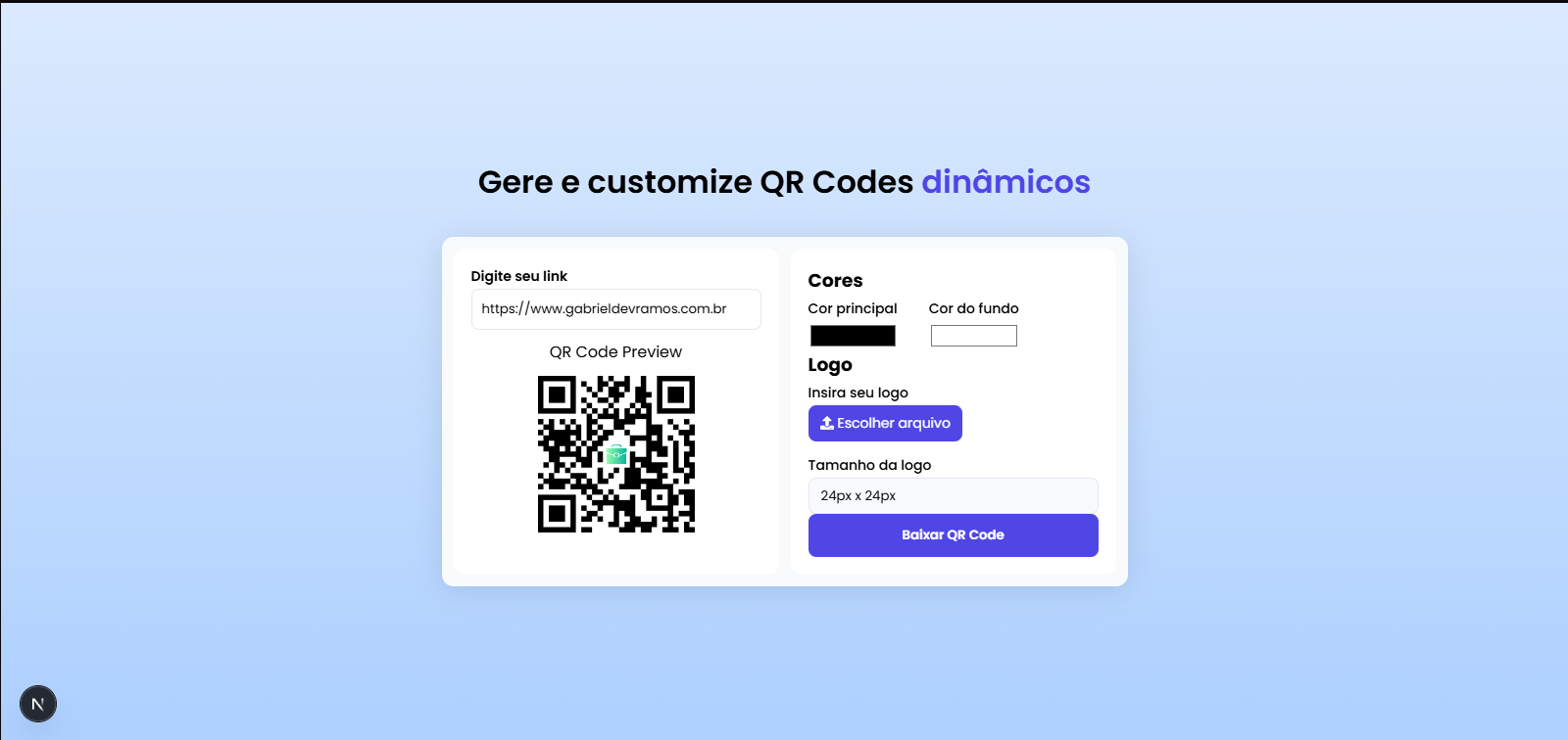 Gerador de QR Code simples e funcional, onde o usuário pode inserir um link ou texto, gerar o código e baixá-lo em formato PNG. A interface é intuitiva, com opções de personalização como cor e tamanho do QR Code
